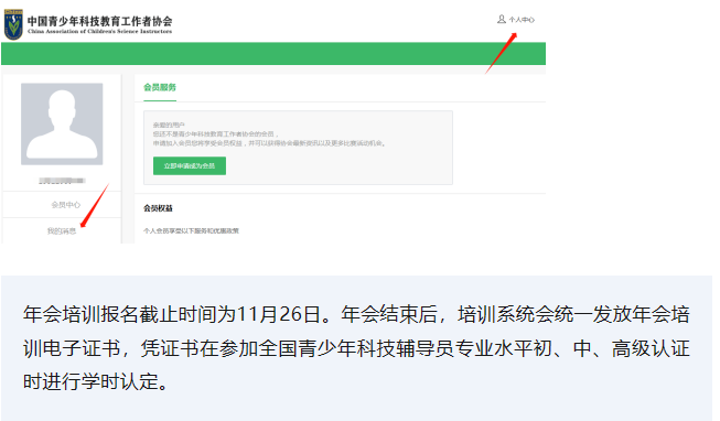 为拓宽教师的参培渠道,提高教师科学素养,促进科技教育高质量发展,注册参加2023中国青少年科技教育工作者协会年会活动将计入12个培训学时,可以作为参加各级科技辅导员认证的培训学时。 已经注册年会成功的老师,可于2023年11月22日后使用注册购票的手机号登录协会网站-个人中心-我的消息中查看年会培训报名链接及邀请码。 培训证书 截止时间:11月26日 年会活动日程 11月24日 星期五 11月25日 星期六 相关链接 联系方式 中国青少年科技教育工作者协会 张春英:010-68516005 conference@cacsi.org.cn 天津科学技术馆 马瑞:022-28322421 13370315925 网站技术支持及购票咨询 13641258182