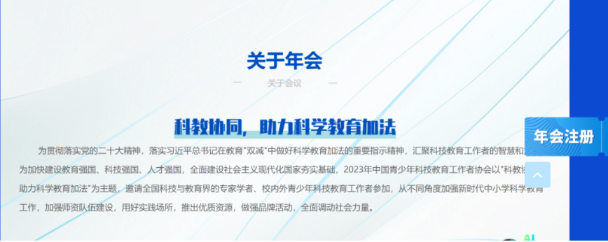 科教协同 助力科学教育加法 中国青少年科技教育工作者协会年会 各位科技教育工作者,2023中国青少年科技教育工作者协会年会将于11月24日-25日于天津举办。现注册通道已开放,我们诚邀您共赴这场科技教育之旅。 只需6步即可完成年会注册 1.输入网址进入年会专题页面 https://conference.cacsi.org.cn/#/IndexDetail 2.页面右上角登陆(已有官网账号)/注册(新用户) 3.向下滑动页面直至出现“年会注册” 4.根据活动选择门票规格、数量,并点击加入购物车 5.核对无误后点击“去结算” 6.确认发票、住宿和购物车信息并完成支付 注:协会会员注册享优先、优惠 中国青少年科技教育工作者协会 张春英:010-68516005 电子邮件:conference@cacsi.org.cn 天津科学技术馆联系人 马瑞:022-28322421、13370315925 网站技术支持及购票咨询:13641258182 联系人